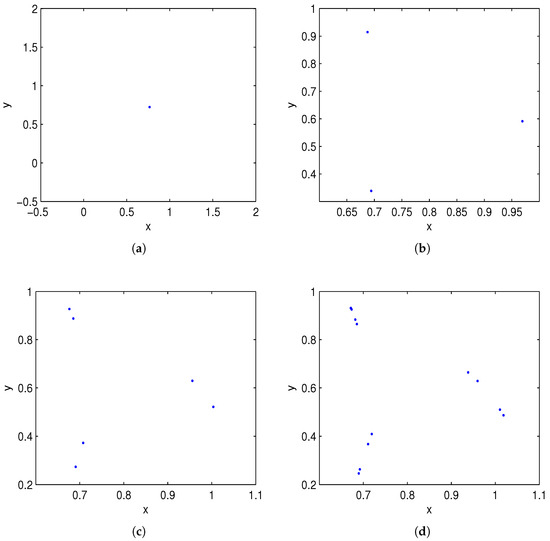Figure 8b presents an isoperiod diagram. Figure 8c,d provide magnified views of the boxed regions A and B in Figure 8a, respectively. The right color bar (30 colors) represents the number of periods. For instance, the period-29 solution appears in light gray, and regions corresponding to periods 1 through 28 are marked by a variety of distinct colors. In addition to periodic solutions, quasi-periodic solutions, which emerge after a Neimark–Sacker bifurcation, are also present. Divergence regions, characterized by parameters that result in unbounded orbits, are illustrated in white. It is important to note that quasi-periodic solutions fall beyond the scope of the period count. Therefore, quasi-periodic regions are identified using Lyapunov phase diagrams, as shown in Figure 8a. Indeed, Figure 8a,b serve as complementary methods for representing phase diagrams. Figure 8b reveals a notable 1:3 resonance when parameters approach , whereas a distinct 1:4 resonance emerges for values near . This observation further underscores the validity of our analytical findings, illustrating their effectiveness in capturing the system’s behavior across a dual-parameter space.
