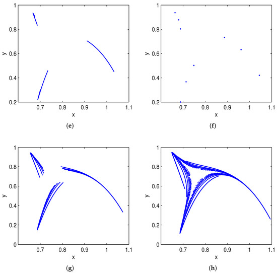 Figure 4 presents the two-dimensional bifurcation diagrams exhibiting a 1:3 strong resonance in both the and space when , with varying within a neighborhood around . Figure 4b displays the corresponding Maximum Lyapunov Exponents (MLEs) related to Figure 4a. It is evident that some MLE values are negative, indicating that system (3) is stable in the vicinity of the 1:3 resonance point . Figure 5 presents the corresponding phase portraits for different values in a neighborhood around . Periodic orbits of periods 1, 3, 6, 12, 24, and multi-periodic orbits (shown in Figure 5g) can also be observed, eventually leading to chaotic behavior (shown in Figure 5h). This follows the classical route to chaos.