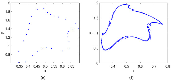 Figure 6 illustrates the bifurcation diagrams in the space and space for , with ranging from to . Corresponding phase portraits are depicted in Figure 7. Figure 6 and Figure 7 demonstrate the Neimark–Sacker bifurcation curve, quasi-period orbits, and invariant circle attracting chaotic set near the 1:4 resonance point, consistent with theoretical predictions. Thus, the numerical results are shown to be in perfect agreement with the theoretical analyses.