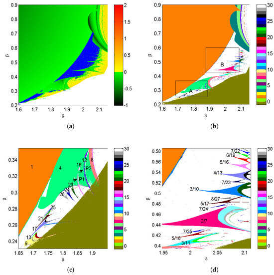 Investigating higher codimensional bifurcations presents a substantial analytical challenge. Consequently, uncovering alternative dynamical behaviors requires reliance on numerical results within parameter spaces. Utilizing the advanced techniques described in references [27,28,29], we employ high-resolution phase diagrams to reveal a broader spectrum and richer tapestry of nonlinear dynamics inherent in this model. These detailed visualizations serve as invaluable tools for understanding the intricate dynamics that emerge under varying conditions. Figure 8a illustrates the Lyapunov phase diagram in the parameter space, with . The right-hand color bar corresponds to the magnitude of the largest Lyapunov exponent. Periodic motions are marked by a smooth transition from dark green to light green. The blue area represents quasi-periodic responses, while the continuous yellow-to-red gradient signifies chaotic regimes. Meanwhile, the white regions denote divergent areas in the phase diagram.