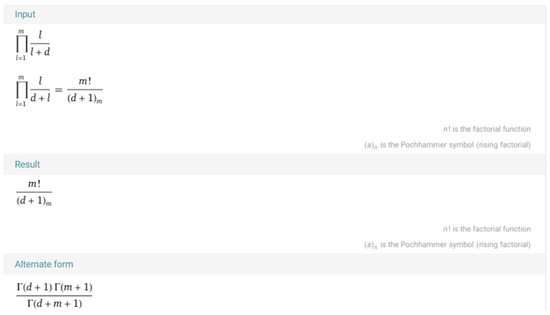 This can be established by visiting the website of Wolframalpha using the link: https://www.wolframalpha.com/input?i2d=true&i=Product%5BDivide%5Bl%2Cl%2Bd%5D%2C%7Bl%2C1%2Cm%7D%5D (accessed on 15 May 2025).