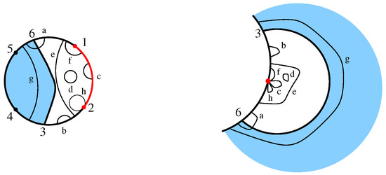 Then the types of possible curves and their images are illustrated in Figure 4 and are as follows: (1) is a closed curve with (labeled c, h in Figure 4), (2) is a curve joining P to a point on (labeled f in Figure 4), (3) is a curve joining a point on to another point on (labeled a, b, e, g in Figure 4) and (4) is a closed curve and (labeled d in Figure 4).