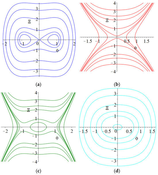 We can see that Equation (2) simplifies to the classic chiral NLSE in Equation (1) for In this work, we will give a qualitative analysis of Equation (1) through the theory of the planar dynamical system and develop diverse wave solutions through two analytic methods, namely the VM and HBM, which are different from the symbol calculation method methods used in [32,33,34,35,36,37,38]. The VM and HBM are more simple and straightforward and do not involve symbol calculation, which can avoid a lot of redundant calculations. The remaining content of this article is arranged as follows. The VP and the Hamiltonian function are explored in Section 2. In Section 3, a quantitative analysis of the system is presented. In Section 4, the VM and HBM are used to develop diverse wave solutions. In Section 5, the results and discussion are presented. Finally, a summary is given in Section 6.