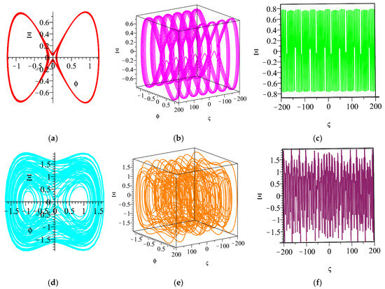 where represents the amplitude and stands for the frequency. Obviously, the parameters , , and may affect the periodic and chaotic dynamical behaviors. To elaborate the corresponding phenomenon, here the parameters are chosen as , , , , , , and , and then the 2- and 3D phase portraits and the time series plot for the different and with the initial conditions as and are presented in Figure 2, where (a–c) for , , and (d–f) for , . We find the system is quasi-periodic at , , but it becomes chaotic when , .