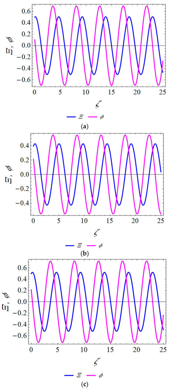 - When and , Equation (20) has the periodic wave solutions (see Figure 1d).