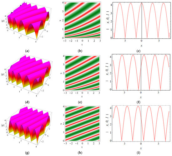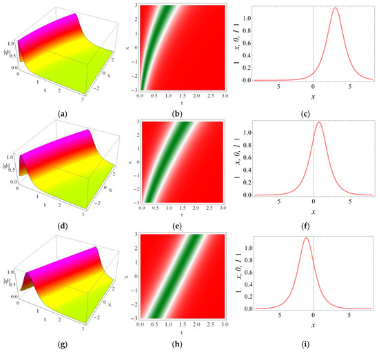 The shapes of in Equation (68) with different fractional orders , (a–c) for , (d–f) for , (g–i) for .