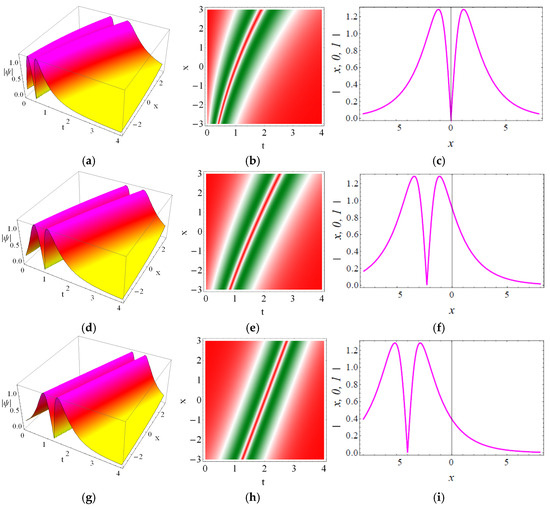 When the parameters are assigned as , , , , , , , , and , we display the behaviors of absolute value for Equation (42) under the different fractional orders , 0.7 and 1, respectively, in Figure 4. Here, we can find the waveform is the bell-shape soliton (bright soliton), and the value of fractional order can influence the structure of the bright soliton; that is, the smaller its value, the more curved the wave is. With the same parameter values, the performances of the absolute value for Equation (50) with the different fractional orders , 0.7 and 1 are unveiled in Figure 5, where it can be seen the waveform is the W-shape soliton (double-bright solitons or double bell-shaped soliton), and we can see that the smaller the value of fractional order , the more curved the double-bright solitons become.