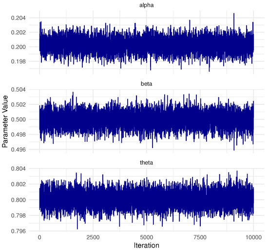 The conditional distributions presented in (16)–(18) lack standard forms, precluding direct sampling methods. To address this challenge, we employ the Metropolis–Hastings (MH) algorithm, an MCMC technique that systematically samples from these non-conjugate posterior distributions. The MH algorithm utilizes a normal proposal distribution, which is initialized based on the MLEs, to generate candidate samples. It subsequently evaluates acceptance probabilities to ensure convergence towards the target posterior distribution. The full MCMC sampling procedure is outlined below.