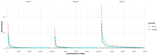 In Bayesian MCMC procedures, obtaining a representative sample from the target posterior distribution hinges on verifying the convergence of the Markov chains, which is a central concern in the analysis. For the dataset from Pop-1 with PA, specified by and , convergence was assessed using two diagnostic tools: trace plots and the Brooks–Gelman–Rubin (BGR) statistic, as illustrated in Figure 2 and Figure 3. The trace plots (in Figure 2) demonstrate that the simulated chains for parameters , , , , and exhibit proper mixing behavior, indicating stability over iterations. Figure 3, presenting the BGR diagnostic, reveals consistency between within-chain and between-chain variances, affirming convergence and the effectiveness of the selected burn-in period in eliminating initial value bias. These results collectively support the validity and robustness of the posterior estimates for the model parameters.