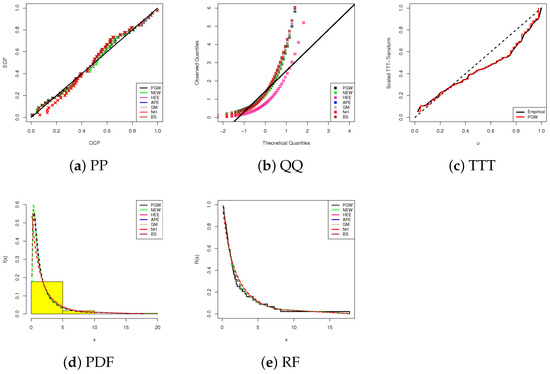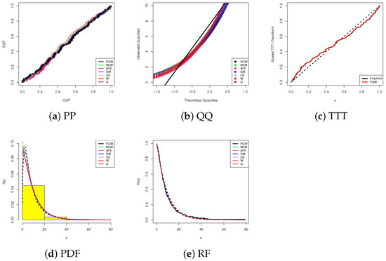 Using data visualizations, in Figure 4, we display our fitting results based on five visual tools, namely, (1) probability-probability (PP), (2) quantile-quantile (QQ), (3) scale TTT-transform (4), (iv) fitted PDF lines with bladder cancer histograms, and (5) fitted RF lines for the highest competitive models for the PGW distribution that provide the largest p-value. All subplots in Figure 4a–d support our conclusion that the proposed PGW lifetime model is the best choice when bladder cancer data is analyzed. Figure 4e reveals that the analyzed bladder cancer data provides an inverted bathtub failure rate and confirms one of the features of PGW failure rates discussed in Section 1.