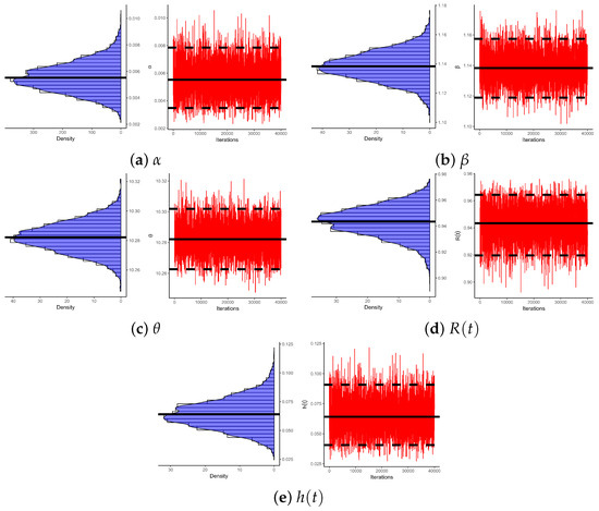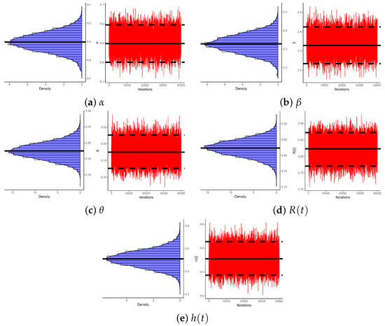 Once 1000 UCS samples are gathered, the MLEs, along with their 95% ACI estimates of , , , , and , are obtained using the ‘’ package proposed by Henningsen and Toomet [23]. Taking and (burn-in), after installing the ‘’ package (proposed by Plummer et al. [24]) in R software 4.2.2, the Bayes point estimations and associated 95% BCI estimations of , , , , or are computed.