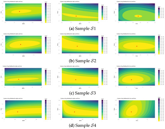 Given the intricate nature of the likelihood equations presented in (9)–(11), obtaining a closed-form analytical solution is not feasible. Instead, iterative techniques such as the Newton–Raphson method must be employed to solve these equations simultaneously, thereby facilitating obtaining the MLEs for the unknown parameters, denoted .
