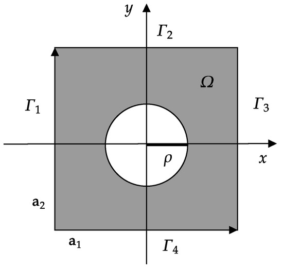 We consider the computational model of the band structure in 2D square lattice PhCs, with its unit cell as shown in Figure 1. The lattice basis vectors are and , where L is the lattice constant and , are unit vectors. The domain is the square region bounded by , , , and , where is parallel to and is parallel to . The 2D PhCs are artificial structures formed by periodically arranged dielectric columns, with the dielectric constant of the dielectric column being and that of the background medium being . We assume that the radius of each dielectric column is and the relative dielectric function is