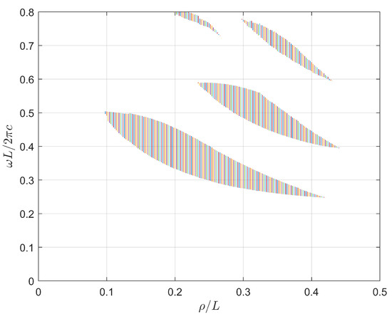 We next investigate the PBG properties in the square lattice for TM polarization by varying the radius of the dielectric column while fixing other parameters. As shown in Figure 7, as the dielectric filling ratio gradually increases to approximately 0.1, the PBG emerges and its width gradually widens. However, as the dielectric filling ratio continues to increase and reaches its maximum value, the bandwidth begins to gradually decrease and eventually narrows and disappears at a specific point. During this process, the position of the PBG shifts to lower frequencies as the dielectric filling ratio increases. Specifically, the first PBG appears at and reaches its maximum bandwidth at , and then disappears at . Similarly, the second PBG emerges at and reaches its maximum bandwidth at .