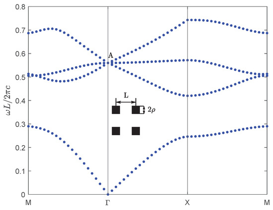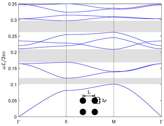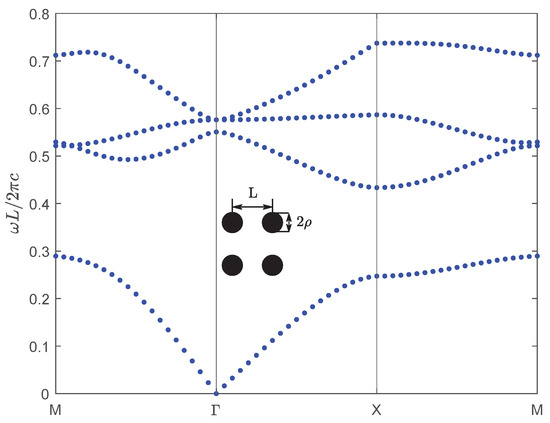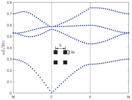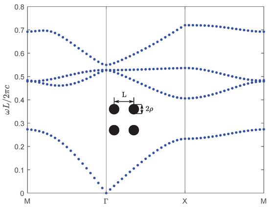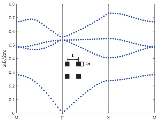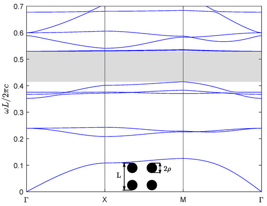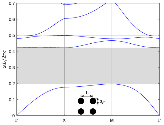 Next, for the second numerical example, we consider a new kind of wide-bandgap semiconductor material BiNbO4, which exhibits exceptional properties and significant potential for various applications. BiNbO4 ceramics are low-temperature sintered materials exhibiting excellent microwave dielectric properties, including a high dielectric constant and low loss. These characteristics make them promising for broad applications in microwave communication, electronic components, and related fields [29]. BiNbO4 ceramics sintered at 1000 °C are relatively dense, and their dielectric properties vary little with frequency and temperature. The dielectric constants and dielectric losses of BiNbO4 ceramics sintered at 1 kHz and 1000 °C are 56.6 and 0.001, respectively [30]. We choose the same crystal structure as the first example above, the lattice constant is and the radius of the dielectric column is , and then calculate the band structure of the materials of the dielectric column for TM polarization, which is shown in Figure 8.