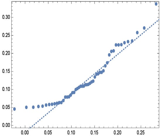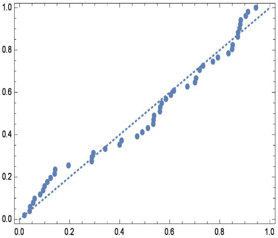 To illustrate and compare the different estimation methods examined in this study, this section presents real-world COVID-19 death rate data from France, as documented by Almetwally [26]. The dataset spans a 51-day period, from 1 January to 20 February 2021. The data are as follows in Table 2. To assess the model’s effectiveness, we conducted several goodness-of-fit tests, including the Anderson–Darling, Kolmogorov–Smirnov (KS), and Cramér–von Mises tests.