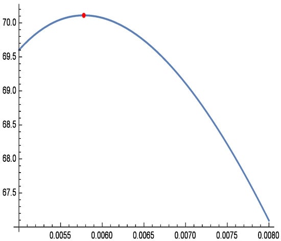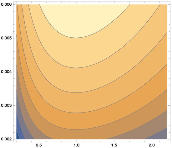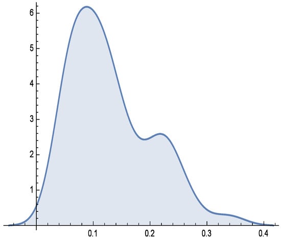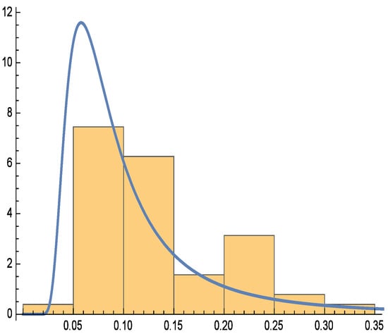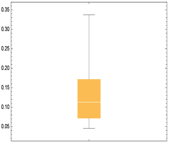 Additionally, Figure 6, Figure 7 and Figure 8 depict the histogram, smoothed histogram, and box-and-whisker plot of the real data, respectively. Figure 9, Figure 10 and Figure 11 illustrate the profile log-likelihood function and contour plot for the parameters and , confirming that it attains a unique maximum, further validating the model’s fit.