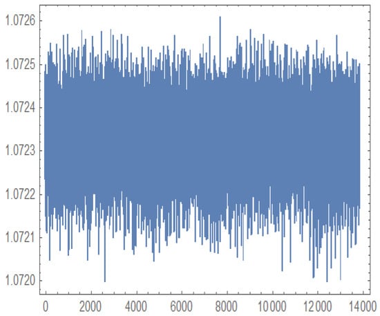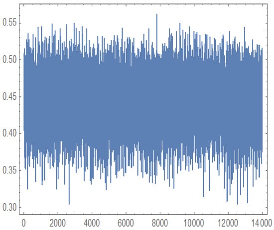 Figure 12, Figure 13, Figure 14 and Figure 15 present the MCMC trace plots of the posterior samples for the unknown parameters, as well as for the survival function and hazard function . These plots are used to evaluate the convergence and mixing behavior of the MCMC algorithm.