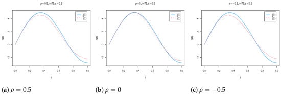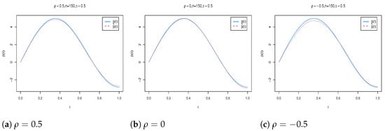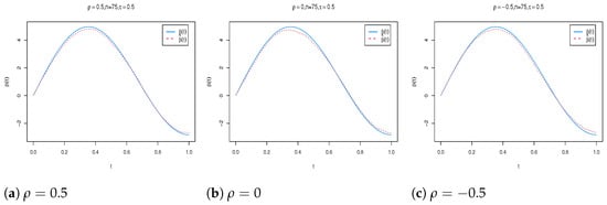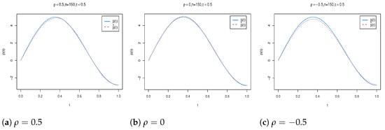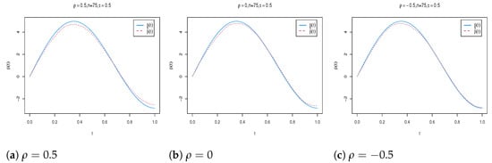 where and Z follow the multivariate normal distribution with the of being , for . In addition, let the spatial parameter , which represents different spatial dependencies. Similar to Xie et al. [37], the weight matrix is set to be where is an q-dimensional vector with all elements being 1, ⊗ means Kronecker product, . Referring to Shin [5], the functional coefficient and are taken, where the are independently normally distributed with mean 0 and variance and . Furthermore, the noninformative prior information type is considered for hyperparameter values of unknown parameters : , where is an m-dimensional vector with all elements being 0. Importantly, we determine the truncation level m such that the first m functional principal components scores s can explain at least 90% of the total variability of the functional predictor .
