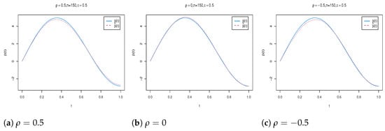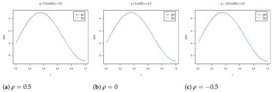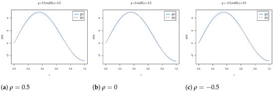 where and are the grid points at which the function is evaluated. The simulation results are reported in Table 4. Moreover, to visually see the accuracy of estimate of function , we plot the true value of function against its estimate under different cases. Due to space limitations, we only list some nonparametric estimation curve results with different spatial parameters in Figure 1, Figure 2, Figure 3, Figure 4, Figure 5, Figure 6, Figure 7, Figure 8 and Figure 9.