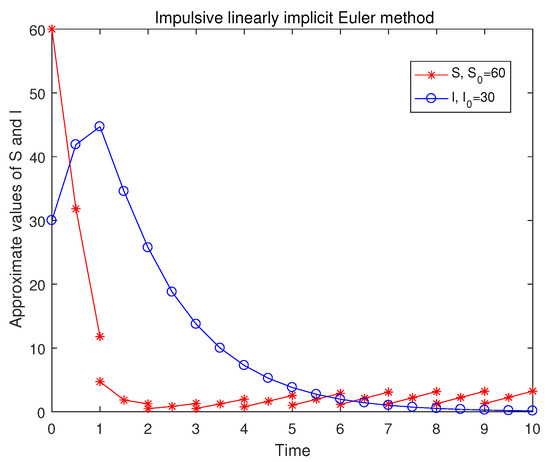 From [23], we know that the expression of the impulsive implicit Euler method (IIEM) for the impulsive SIR system (1) is as follows: