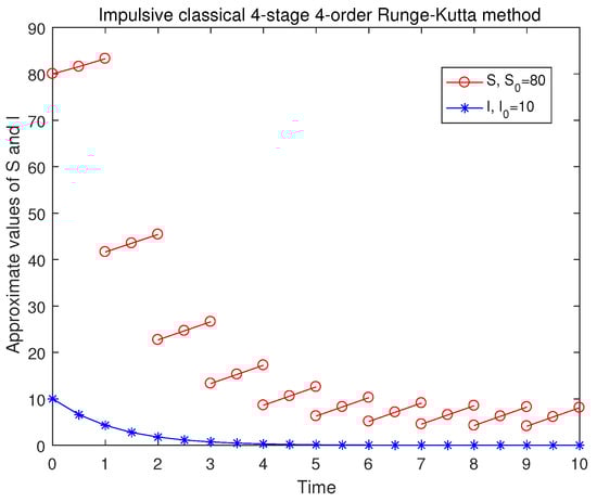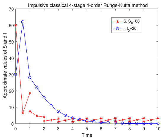 Impulsive classical 4-stage 4-order Runge–Kutta method for (2) as , 0.5, , , , , and .
