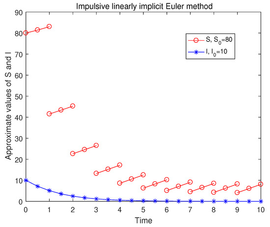 In recent years, the linearly implicit Euler method (LIEM) for SIR equations without impulsive perturbations has gained increasing attention as a very effective numerical method [16,17,18,19]. In [16], the authors proposed the LIEM numerical method thresholds for aged SIS models with finite maximum age, in which some numerical basic reproduction numbers were provided and the stability of the disease-free equilibrium was investigated. In [17], the authors studied a numerical reproduction number of the linearly implicit Euler–Riemann method for a single nonlinear age-structured population model with infinite age. In [18], a numerical threshold of a LIEM for a nonlinear infection-age SIR model was studied. In [15], the impulsive linear implicit Euler method (ILIEM) was first proposed to solve the SIR epidemic equation with a pulse vaccination strategy, and it was pointed out that the method has the advantages of keeping the exact solution positive and maintaining the global attractiveness of the disease-free periodic solution. To the best of our knowledge, ILIEM has not been applied to solve the SIR epidemic model with nonlinear incidence rates and proportional impulsive vaccination. The discrete Floquet’s theorem and small-amplitude perturbation skills are also first applied to prove that ILIEM maintains the local stability of the disease-free periodic exact solution without restrictions on the step sizes, and further, ILIEM maintains the global asymptotical stability of the exact solution.