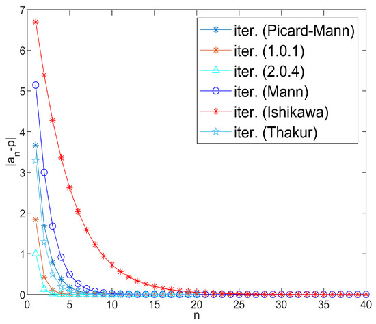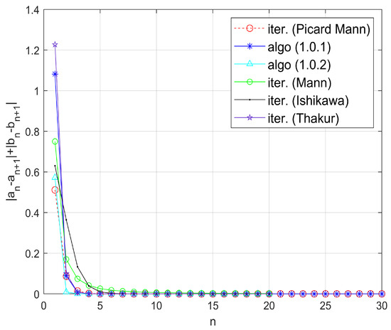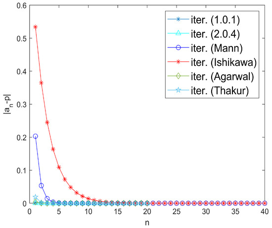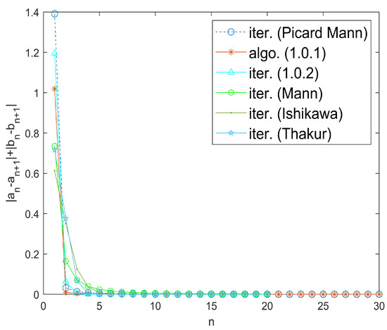 Let be endowed with the usual norm. Define a mapping by Numerical simulations show that is a unique fixed point of S. Also, S satisfies -property given by (4). Choose for all . We pick as initial guess. Now, all the conditions of Theorem 3 are fulfilled and iterative algorithm (1) converges to Clearly, it converges faster than the iterative algorithms given by Picard–Mann, Mann, Ishikawa, and Thakur, as shown in Table 3 and Figure 3.