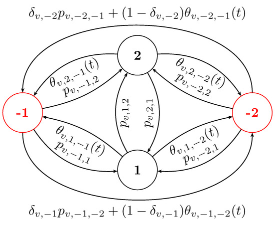 The equations above may seem intricate. To provide a clearer understanding of the master equation, Figure 1 depicts a system featuring two good and two bad states, offering a visual aid to grasp the concept more easily. Suppose the good states are and the bad states are . The diagram illustrates the transition rates of the probability of each state of any node to other states at time t. To facilitate distinction, we represent the bad states and with red nodes. For instance, the probability of node v being in the good state 1 at time t transitions to state 2 at a rate of . The transition rates to the bad states −1 and −2 are and , respectively. Here, is the neighbor-independent transition of v, while and are the neighbor-dependent transitions. We refer to such a diagram as a state transition diagram.