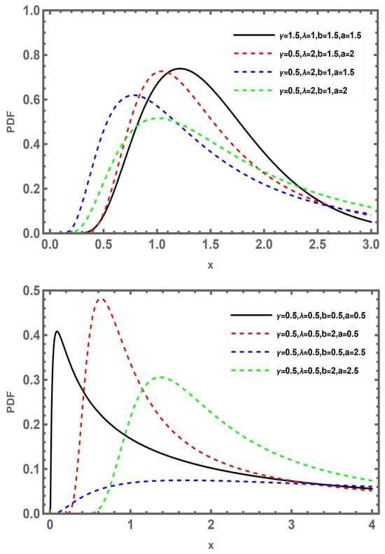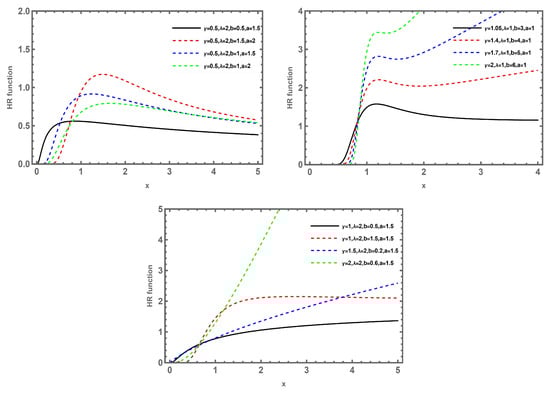 Upon using different values of parameters as shown in the previous two lemmas, the behavior of the HRF of the GNEWD can be increasing, upside-down bathtub, and modified upside-down bathtub as shown in Figure 3.