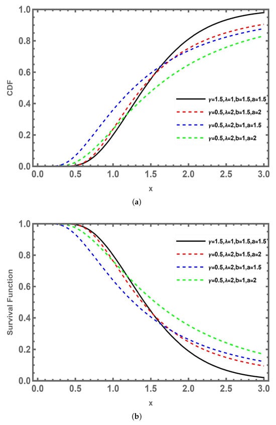 (a) The CDFs of GNEWD with different values of parameters; (b) the survival functions of GNEWD with different values of parameters.
