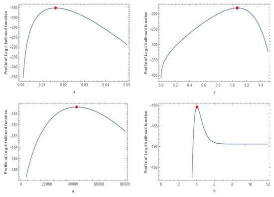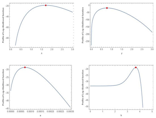 For this data, Table 6 provides a summary of the numerical results of the parametric and non-parametric tests based on the MLEs of all comparison distributions. At a level of significance of , it is possible to demonstrate that all distributions fit the plasma concentrations of the indomethicin data based on the p-value related to the K-S test. Since the GNEWD has the lowest value based on the parametric tests AIC and BIC, it is clear from Table 6 that it fits this data better than other distributions. Based on the plasma concentrations of the indomethicin data, Figure 5 displays the log-likelihood function profiles for each parameter. The approximate 95% CIs for , , a, and b are [1.2896, 2.1171], [0.5794, 0.9607], [0, 0.0004], and [1.9355, 5.4211], respectively, derived using the asymptotic variance–covariance matrix based on the MLEs for this data. The values of K-S and the corresponding p-value for the plasma concentrations of the indomethicin data are also shown in Table 7, along with all estimations of the unknown parameters based on the different methodologies that were considered in the previous section. When the K-S test is employed with the corresponding p-value, it is evident from Table 7 that the LSE is the optimal method for the plasma concentrations of the indomethicin data.