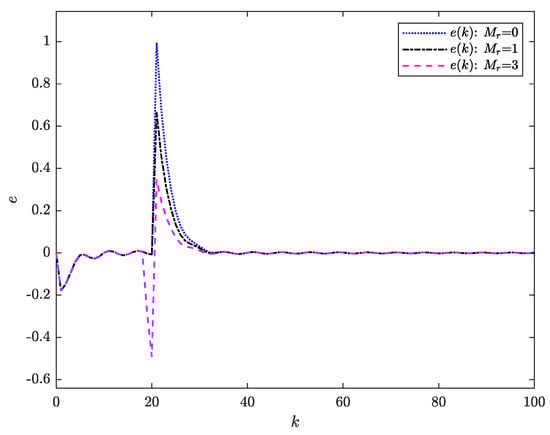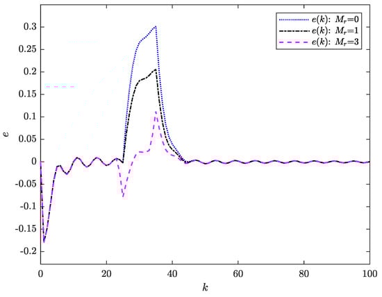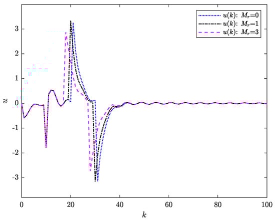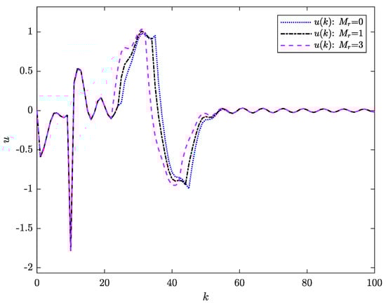 The tracking performance of system (39) is shown in Figure 7. From the figure, it can be observed that as time increases, the output signal of system (39) asymptotically tracks the reference signal, regardless of whether preview action is employed. By comparing the system responses under controllers with preview (i.e., or ) and without preview (i.e., ), it can be observed that the preview-based controllers enable the output vector to respond in advance and allow the system output to track the reference signal more rapidly. The tracking error of the system is shown in Figure 8. By examining Figure 7 and Figure 8 together, it can be observed that increasing the preview horizon improves the tracking accuracy, and the overall system error decreases as the preview horizon lengthens. Figure 9 shows the control input of the system. It can be seen from Figure 9 that the control input remains bounded. These findings verify the effectiveness of preview control in enhancing the system’s tracking performance.