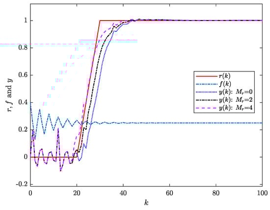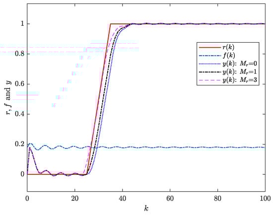 As mentioned in the introduction, the discrete-time system corresponding to the pressurizer control system model is given by Equation (2). By setting the sampling interval as , it follows from (2) and that the time delay . The performance index function (5) is specified with weighting matrices and , while the disturbance attenuation level is set to . In system (2), the parameter is chosen as . The initial condition is , . We perform numerical simulations for two distinct reference signals.