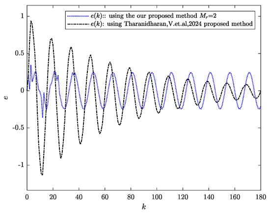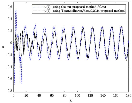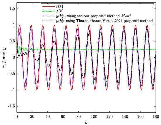 To enable a direct comparison between the proposed preview tracking control method and the repetitive tracking control method based on reference [], we applied both approaches to simulate Example 2. Since repetitive tracking control is designed for periodic signal tracking, the reference signal was selected as: . In addition, we set , , , while keeping all other parameters the same as those in Example 2. The simulation results are shown in Figure 10, Figure 11 and Figure 12, where the black line represents the control method from reference [], and the blue line corresponds to the proposed control method.