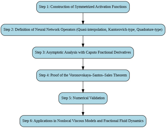 The methodological framework adopted in this work integrates advanced tools from approximation theory, fractional calculus, and neural operator design. The proposed approach unfolds through a structured pipeline that begins with the mathematical formulation of symmetrized activation functions and progresses through the development of three families of neural network operators: quasi-interpolation, Kantorovich-type, and quadrature-type. Subsequently, a rigorous asymptotic analysis is performed, incorporating fractional differentiation via Caputo derivatives, which culminates in the formal proof of the Voronovskaya–Santos–Sales Theorem—a cornerstone result that extends classical approximation theory into the fractional domain. This theoretical foundation is validated through comprehensive numerical experiments, including applications in nonlocal viscous models and fractional fluid dynamics. The entire workflow is summarized in the pipeline depicted in Figure 1.
