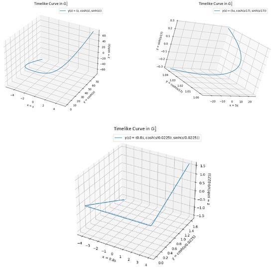 We consider timelike curve in with and [30,31]. If the values of curvature and torsion are incorporated into the Euler–Lagrange Equations (4) and (6)), it can be observed that the curve γ serves as an example for the critical point for of the functional H (see, Figure 1).