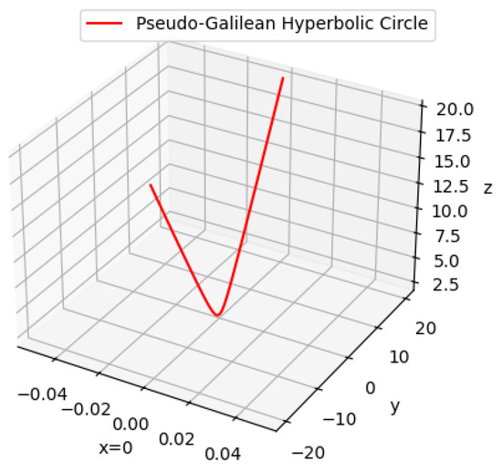 This curve is referred to as a hyperbolic circle (or “h-circle”) in pseudo-Galilean space. It can be visualized as a hyperbolic spiral in the z–y plane (Figure 2).
