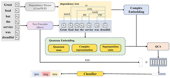 QEDFM consists of four components: sequence preprocessing, an embedding module, a dependency fusion module, and sentiment recognition. First, sentence dependency relations and sequential feature representations are extracted using various methods. Next, the sequential features are encoded into superposition states through the quantum embedding module, while the dependency relations are constructed into density matrices using complex-valued embeddings as input for the dependency fusion module. Subsequently, we employ a quantum cross-attention mechanism to treat the dependency relation features as an information source, allowing them to interact with the text sequence features. This approach facilitates bidirectional attention and information exchange between the dependency relation features and the text sequence features, thereby enhancing the model’s comprehension of sentence structure and semantics. Finally, we input the resulting aspect features into a classifier to recognize sentiments.
