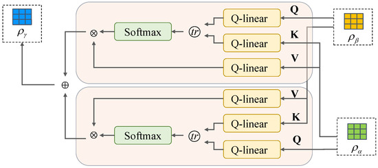 We use the quantum cross-attention mechanism to fuse the utterance sequence and dependency features, and the main process is shown in Figure 2. In the figure, is the sequence feature representation after quantum embedding, and is the dependency feature after the complex-valued embedding modules are both fed into the three Q-linear layers, outputting K, V and Q, respectively, to achieve feature fusion through the cross-attention mechanism. Q-linear is analogous to the quantum unitary evolution of the linear layer to match the operations of the density matrix, as exemplified by in Figure 2:
