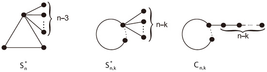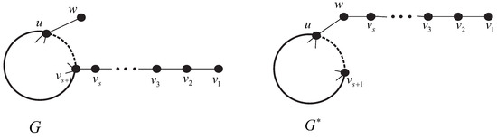 Next, we prove the right inequality. Suppose that the graph G has exactly one pendant vertex. By , according to the properties of this graph class, we can conclude that , and thus the theorem holds. Suppose that G has at least two pendent vertices. In the first step, by Operation 1, the subtrees hanging on the vertex in induced cycle of G are transformed into paths with the corresponding number of vertices. Repeated applications of Operation 1, transform all subtrees hanging on the vertex in induced cycle of G into pendant paths. In the second step, by applying Operation 1 to merge the aforementioned pendant paths, we successfully derive the extremal graph . By Lemma 22, it can be known that the right inequality holds. □