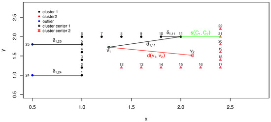 For outliers and , despite and , their neighborhood densities and are zero. Consequently, their compactness cannot be defined using traditional nearest-neighbor metrics. Instead, we compute compactness by associating each outlier with the nearest density-nonzero observation, i.e., and . This approach could effectively avoid spurious local optima in assignments. The advantage of this novel compactness metric lies in its ability to prevent outliers from being misclassified into local optima due to their large distances from clusters. As shown in Figure 1, observations and are outliers. The distance between them is shorter than their distances to Cluster 1. If the classical neighborhood distance metric is used, these two observations would likely be identified as a new cluster because they are close to each other and far from all other clusters, which contradicts our expectation that outliers should not affect the true number of clusters. Admittedly, this approach increases intra-cluster compactness. However, this issue is common in existing clustering algorithms unless outliers are completely discarded. We argue that a moderate increase in intra-cluster compactness is a more acceptable trade-off than distorting the true cluster structure.
