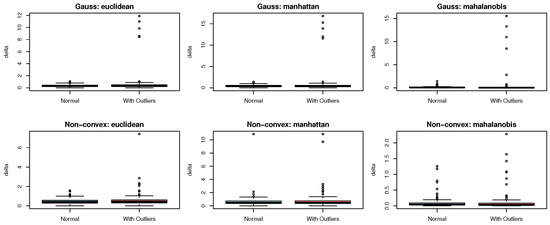 It is worth noting that the neighborhood distance (delta) calculated based on the neighborhood density as mentioned above is computed in the Euclidean space. An interesting question is whether this definition can still exhibit stable robustness when using the Manhattan distance and Mahalanobis distance for calculation. To verify this idea, we designed a simple comparative experiment using R software: the experiment was divided into two groups of data, namely, Gaussian distribution and non-convex distribution. Each group was further divided into two scenarios: with outliers and without outliers. The neighborhood distance delta was calculated using the Euclidean distance, Manhattan distance, and the Mahalanobis distance, respectively, and the boxplots of the results are shown in Figure 2.