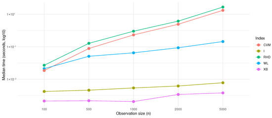 To verify the aforementioned analysis conclusions, we conducted simulation experiments using R 4.3.2 software. We compared the computation times of the newly proposed index with those of four other indices under the conditions of sample sizes , and dimension . All experiments were repeated 10 times for each sample size, and the median elapsed time was calculated; the results are presented in Figure 3. It should be noted that this experiment was carried out on a personal computer with the following configurations: Brand: Dell; Processor: Intel(R) Core(TM) i9-10920X CPU @ 3.50 GHz; Installed RAM: 32 GB.