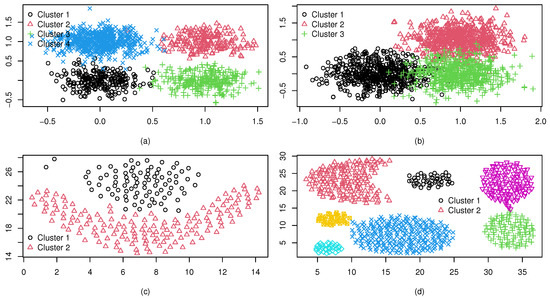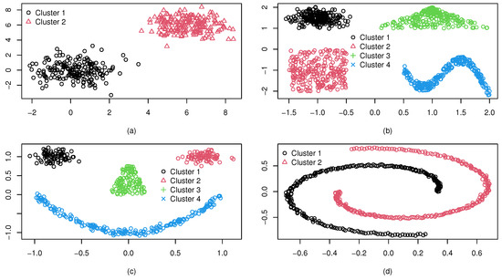 We consider some synthetic datasets with cluster shapes different from an ellipsoid, and denote them as . The dataset (a) consists of two isolated clusters, each with 200 observations generated from Gaussian distributions. Dataset (b) consists of four isolated clusters with different shapes: elliptical, triangular, rectangular, and wave. In dataset (c), there are also four isolated clusters of different shapes. However, the ellipsoid boundaries are not fully isolated, unlike the case in dataset (b). Dataset (d) contains two spiral clusters each of 250 observations. All the synthetic datasets are in two dimensions, which were randomly generated by using the package “‘mlbench’” in R. Figure 4 shows the four synthetic datasets, and it can be seen that the cluster numbers of (a)–(d) are 2, 4, 4, and 2, respectively.