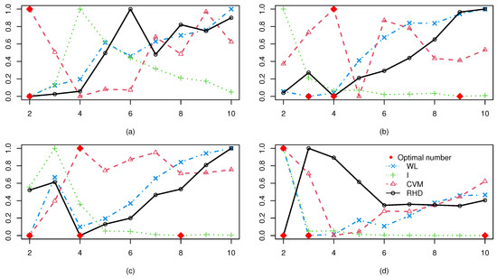 The WL, I, CVM, and RHD values with different number of clusters under the synthetic dataset: (a) Dataset (a); (b) Dataset (b); (c) Dataset (c); (d) Dataset (d).