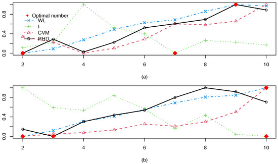 From the analysis of the computation times of the five indices, namely, CVM, I, RHD, WL, and XB, under different sample sizes (n) in Figure 3: The computation time of Index I (the yellow line) is extremely low, and its increase with growth in the sample size is minimal, showing an approximately horizontal straight-line trend. Its time complexity is most likely , and its computation logic may not expand linearly with the sample size. The computation time of Index XB (the purple line) is stable in the early stage and rises slowly in the later stage, with an overall gentle growth trend, which may be close to a linear or low-order polynomial complexity like . The computation time of Index WL (the blue line) shows a moderate linear upward trend with increase in the sample size, which is consistent with the characteristics of linear complexity. Its computation may involve single-round linear operations of traversing samples. The computation times of Index CVM (the red line) and Index RHD (the green line) increase significantly with growth in the sample size, and the upward slope is steeper, tending to or a higher-order polynomial complexity. When the sample size increases, due to the involvement of complex sample interactions (such as nested loops, quadratic statistic calculations, etc.), the computation load expands quadratically with n, resulting in a rapid increase in computation time. However, the strict time complexity needs to be verified by combining the algorithm source code or mathematical derivation. Here, the engineering inference based on the computation time trend can help understand the differences in the computation efficiency of each index.