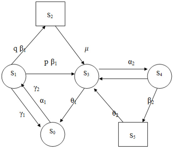 A = α 1 α 1 0 0 γ 1 ( γ 1 + q β 1 + p β 1 ) p β 1 0 θ 1 0 ( θ 1 + α 2 ) α 2 0 0 γ 2 ( β 2 + γ 2 ) .
