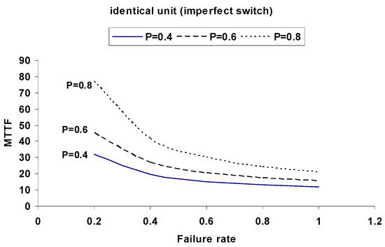 Figure 9. MTTF versus Failure Rate for Identical Units under Different Switching Probabilities (p = 0.4, 0.8, 1).