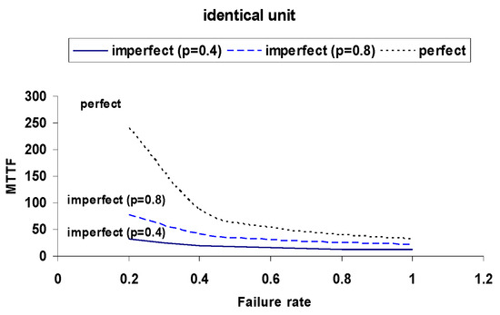 Figure 13. Comparison of MTTF for Identical and Non-Identical Units with Perfect Switch (p = 1).